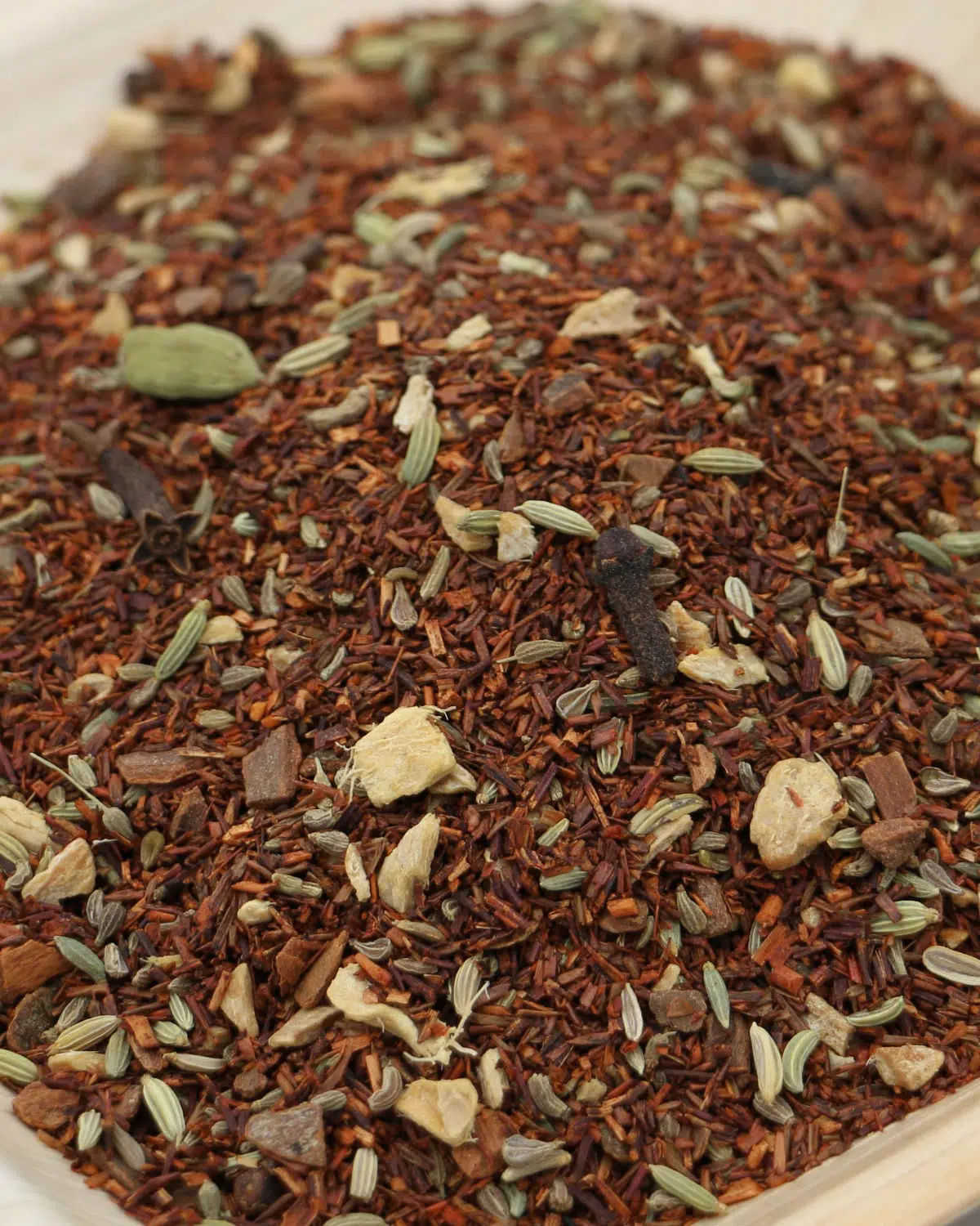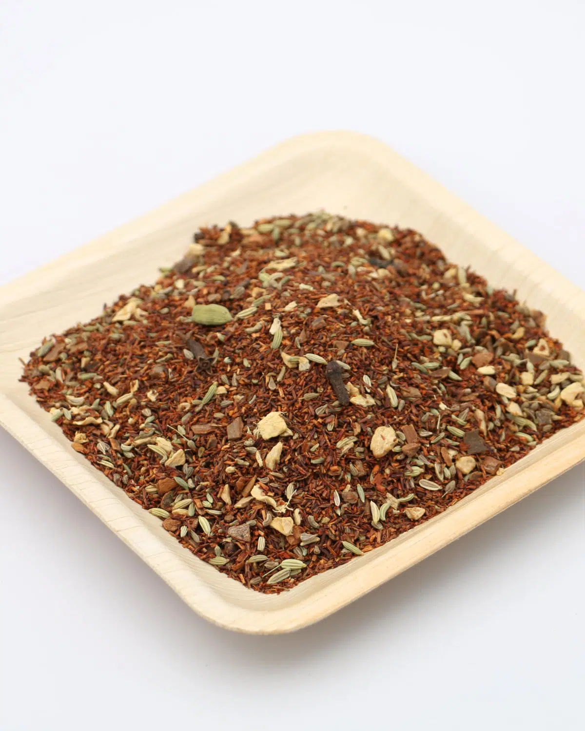 Le thé Rooibos Chai est parfait pour calmer la soif. On peut le boire chaud ou froid et il dispose de son propre goût. Le thé rooibos est produit exclusivement à partir des feuilles et des tiges du rooibos.